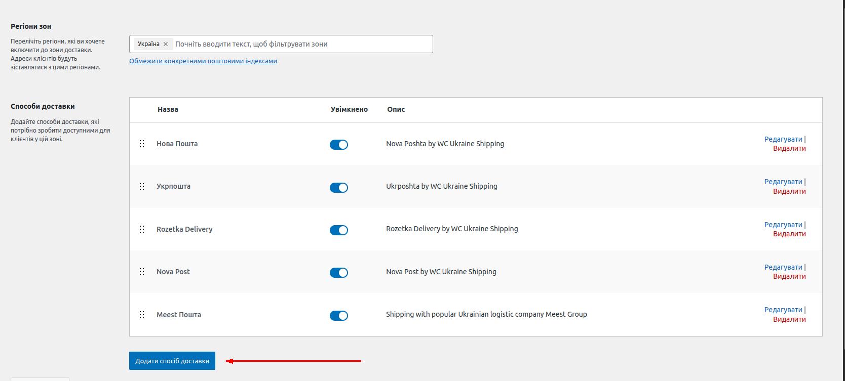 Додайте стільки методів доставки, скільки вам потрібно за аналогічним принципом. Після збереження налаштувань у вашому чекауті з'являться декілька варіантів доставки. Плагін буде автоматично рендерити необхідні поля для кожного з цих видів доставки.