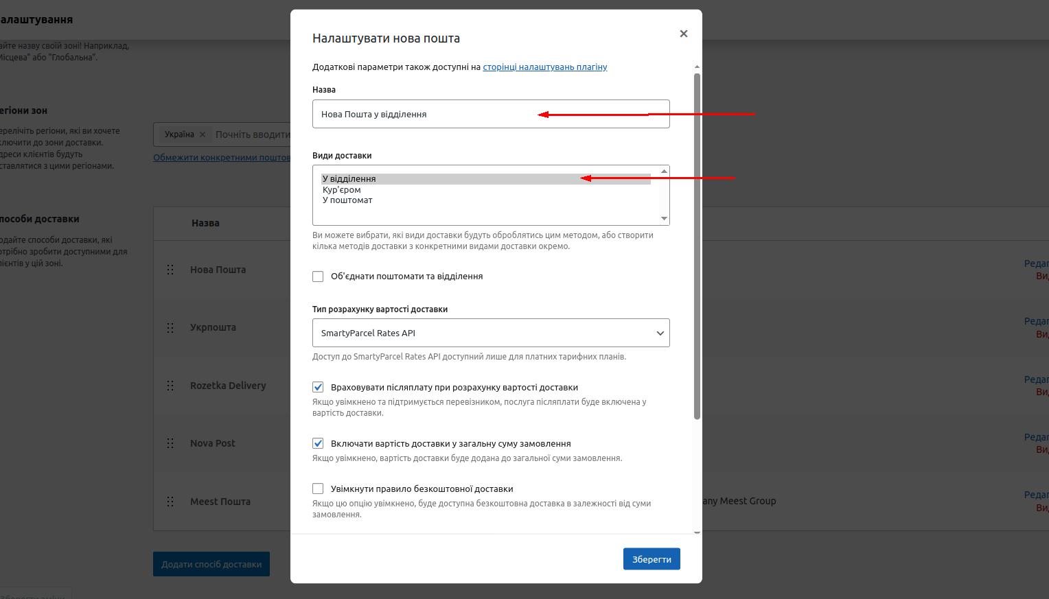 У налаштуваннях методу доставки знайдіть та відредагуйте 2 опції - "Назва методу доставки" та "Види доставки". Ви можете комбінувати 2 види доставки разом (наприклад, відділення + поштомат), або вказати тільки один конкретний вид.