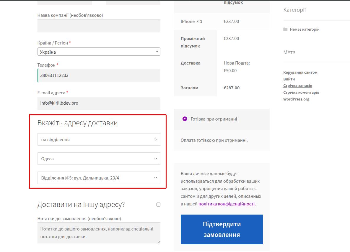 После этого переходим на сайт на страницу оформления заказа и проверяем работоспособность плагина.