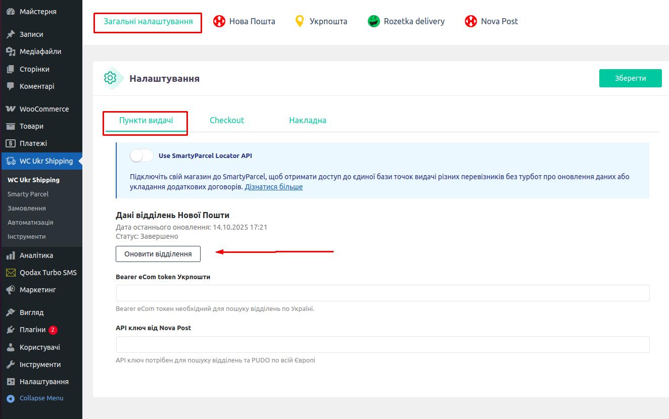 На странице настроек откройте раздел "Общие настройки" -> Пункты выдачи. Найдите блок данных отделений Новой Почты и нажмите кнопку "Обновить отделения".