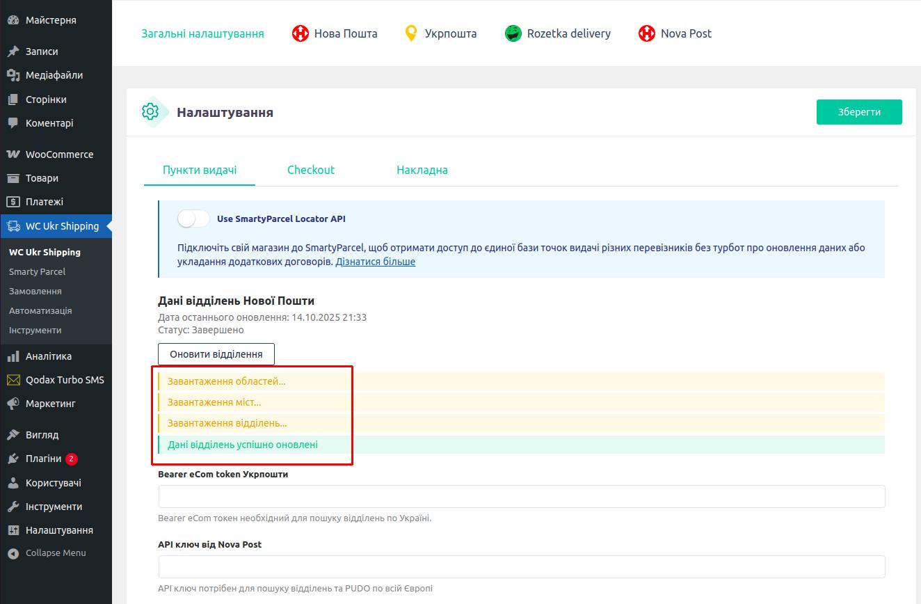 С версии 1.17.2 плагин начал поддерживать сервис SmartyParcel Locator, который позволяет получить доступ к единой базе отделений разных перевозчиков без забот об обновлении данных или заключении дополнительных договоров. SmartyParcel гарантирует предоставления доступа абсолютно бесплатно после подключения магазина к платформе. Руководство по подключению