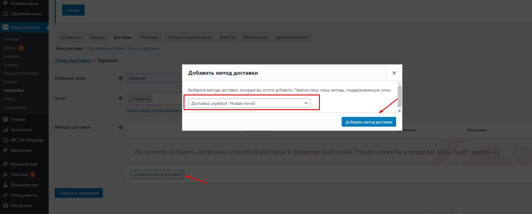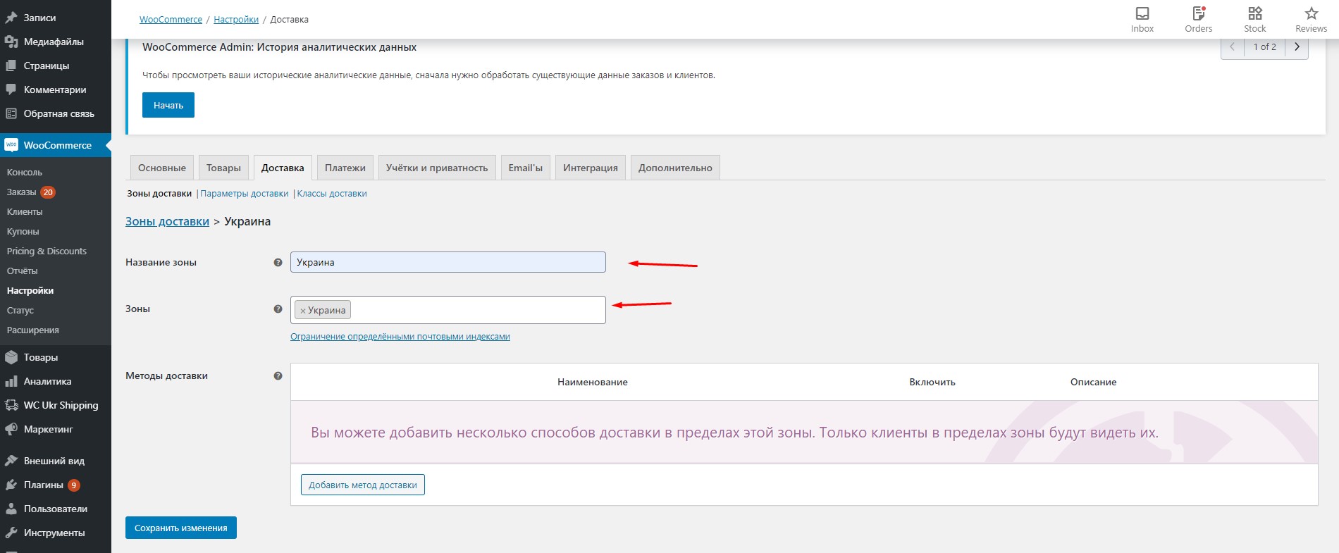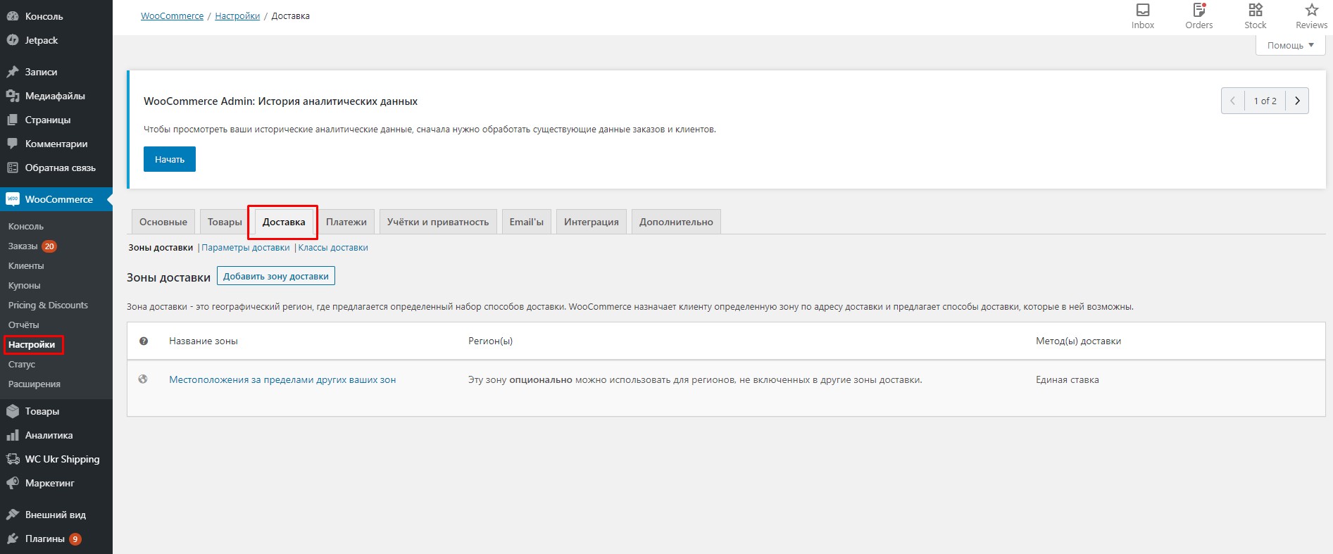 В админ-панели перейдите в пункт меню WooCommerce -> Настройки -> Доставка