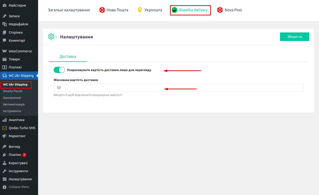 Откройте страницу WC Ukr Shipping -> Rozetka Delivery. Во вкладке доставка вы можете задать фиксированную стоимость достаки, а также включить ее стоимость в итоговую сумму заказа.
