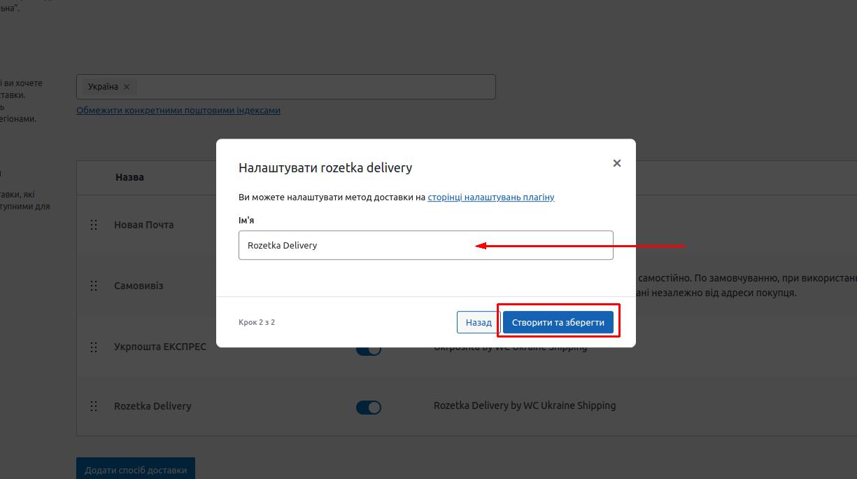 Найдите в списке доступных методов Rozetka Delivery (важно, чтобы метод доставки был именно от нашего плагина) и нажмите кнопку "Продолжить". На следующем этапе можете изменить название метода (по желанию) или просто нажать кнопку сохранения.