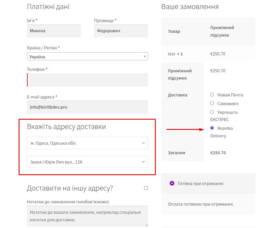 После проделанных действий откройте вашу страницу чекаута и проверьте работоспособность метода доставки. При выборе метода Rozetka Delivery, плагин должен будет показать 2 новых поля выбора города и пункта выдачи.