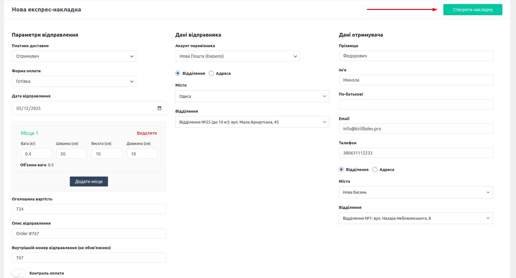 После нажатия кнопки создания ТТН, плагин автоматически вытянет все доступные ему данные о заказе и введет их в форму создания накладной. Вам останеться лишь сверить (или возможно, дозаполнить часть данных) и нажать на кнопку Создания ТТН.