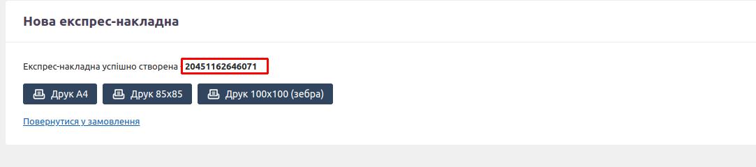 После нажатия на кнопку генерации ТТН, если процесс прошел без ошибок, плагин привяжет созданную ТТН к заказу и выведет вам ее номер на экран.