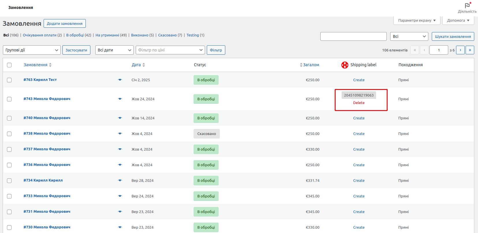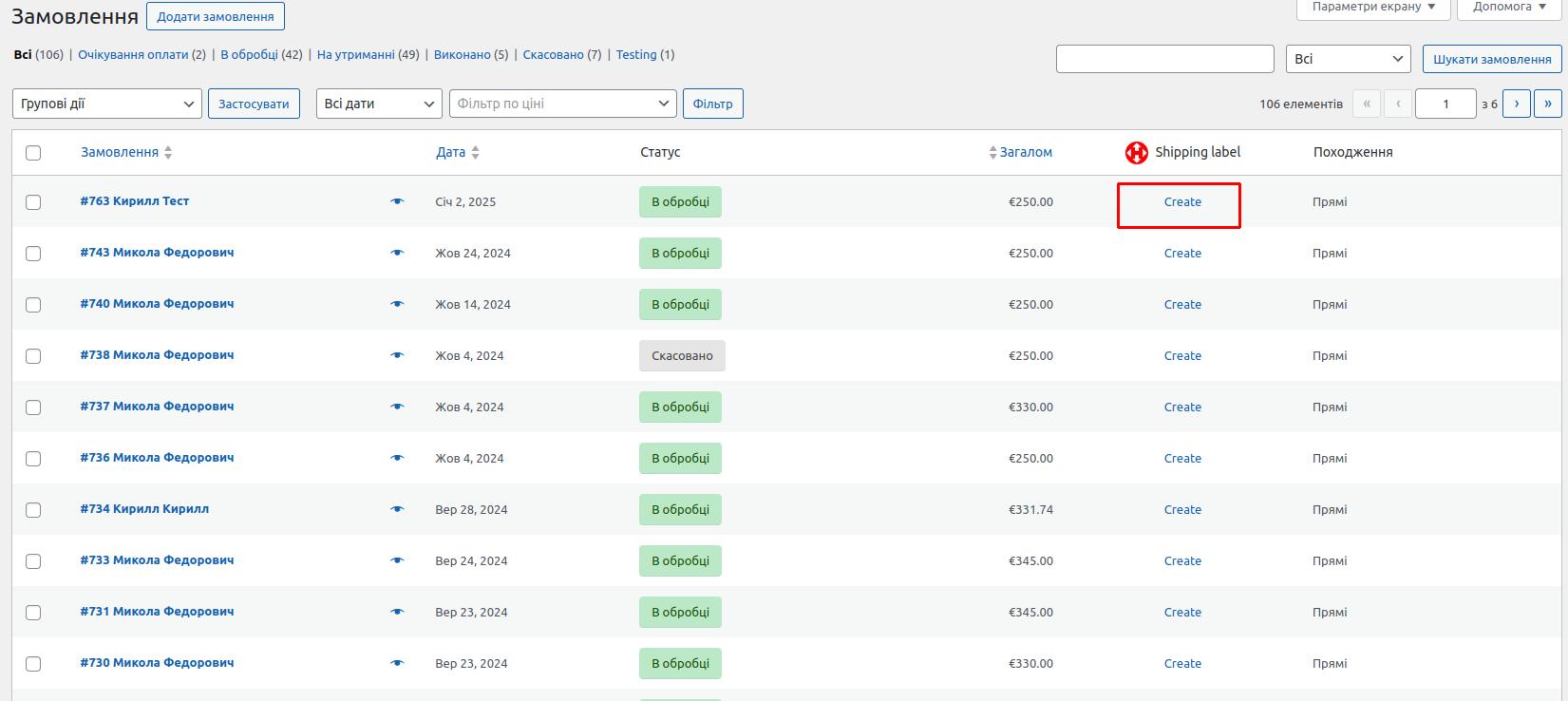 Вы можете создать ТТН из двух мест: страница списка заказов WooCommerce и на странице конкретного заказа WooCommerce.