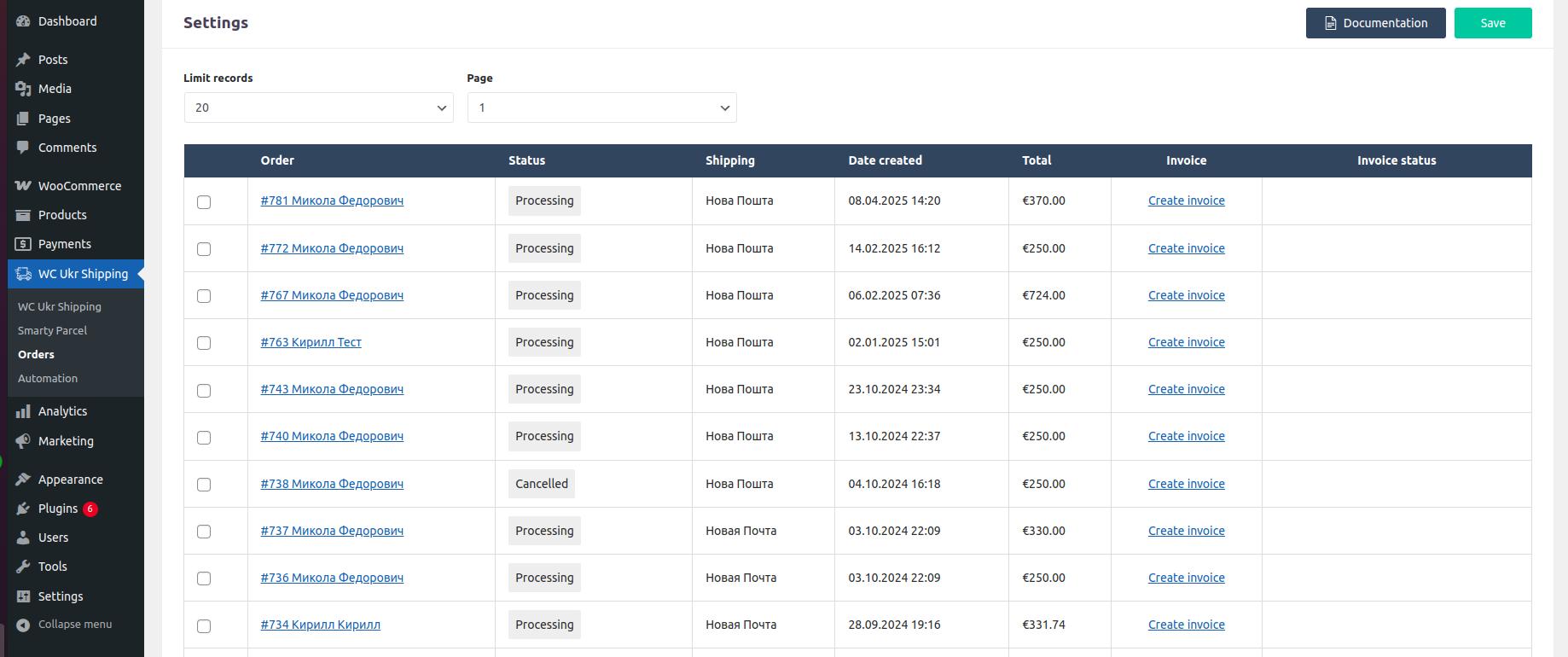 Вы можете массово создавать, удалять и печатать накладные для ваших заказов в один клик. Для этого, откройте пункт меню WC Ukr Shipping -> Orders.