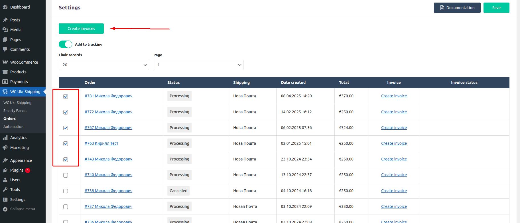 Для того, чтобы массово создать накладные, выберите нужные заказы и нажмите появившуюся кнопку Create invoices. Вы также можете автоматически добавить накладные в трекинг систему SmartyParcel после их генерации. Для этого должен быть активный тумблер Add to tracking