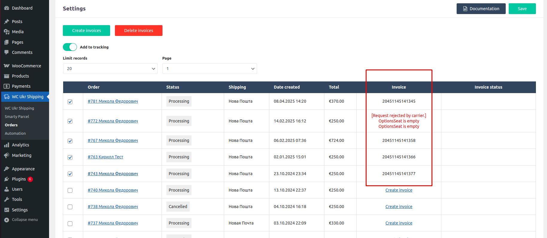 Плагин попробует автоматически сгенерировать накладные для выбранных вами заказов. При условии, что данные доставки были заполнены корректно, плагин отобразит номер созданной накладной в колонке Invoice. Если же создать накладную не получится, в эту колонку будут выведены ошибки от Smarty Parcel.