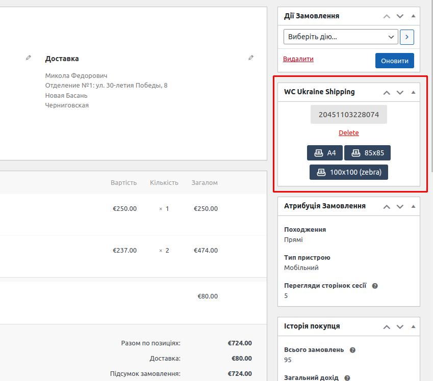 На странице редактирования заказа WooCommerce в метабоксе WC Ukraine Shipping