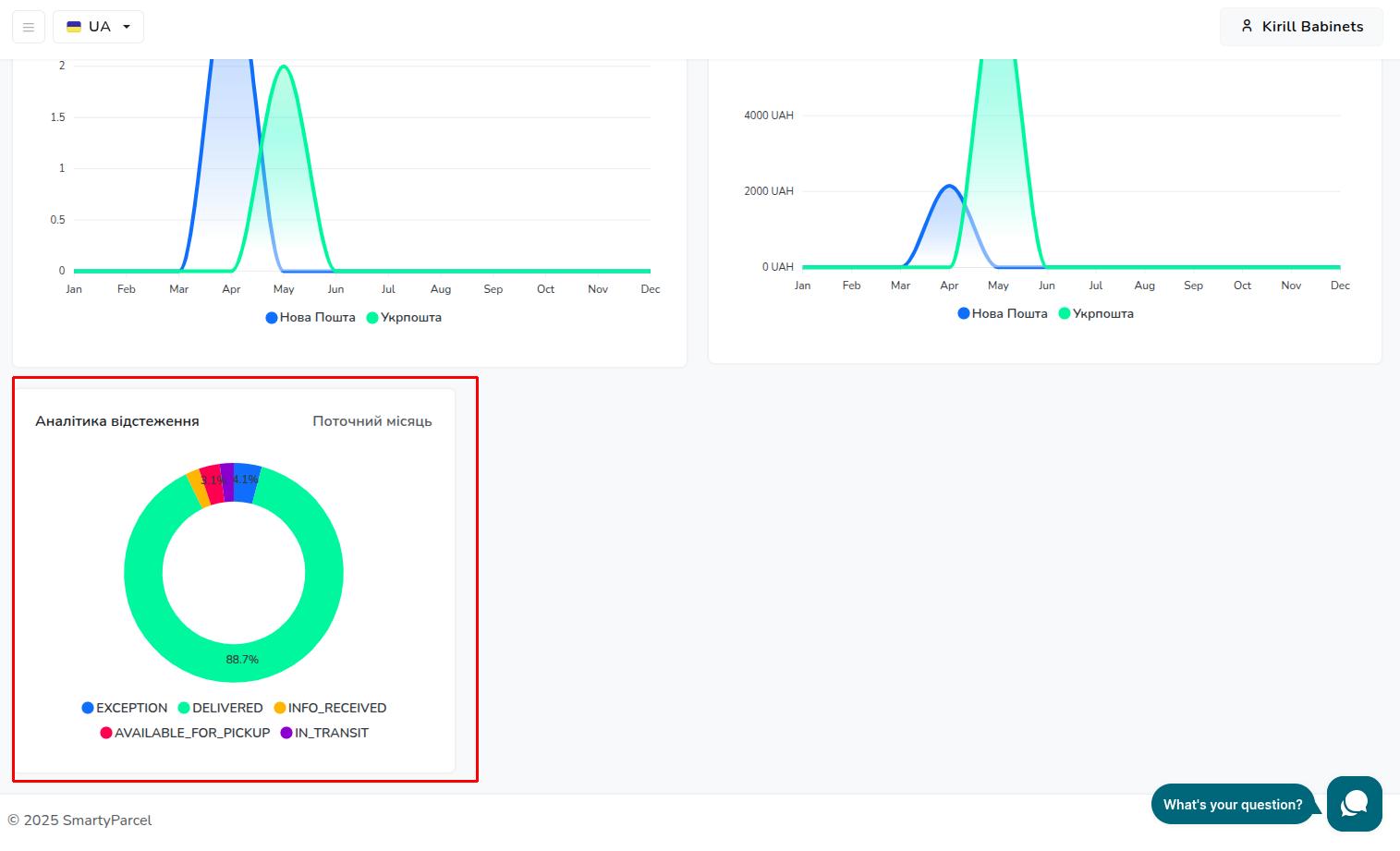 Добавили диаграмму движения посылок, отслеживаемых SmartyParcel. Данные формируются в разрезе статусов трекинга (статус, присваиваемый SmartyParcel). Виджет находится на главной странице панели клиента.